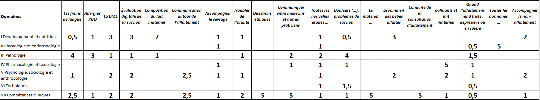 Pour les consultantes en lactation IBCLC qui doivent recertifier, vous trouverez dans le tableau ci dessous les domaines couverts par les formations de 2023 et le nombre de CERPs correspondant :